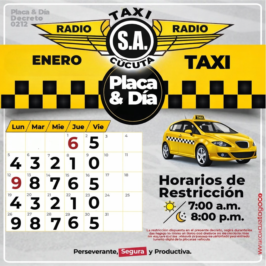 La Alcaldía de San José de Cúcuta, a través de la Secretaría de Movilidad, ha establecido el Pico y Placa para taxis durante el mes de enero, con el objetivo de mejorar la movilidad, reducir la congestión vehicular y garantizar un servicio de transporte más eficiente en la ciudad.